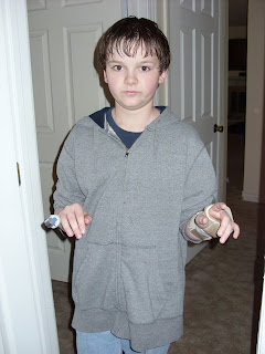 We had his finger splint from when he broke 2 fingers last year. Kenny's splint for his wrist for his carpal tunnel. 2 of Kenny's knee braces and one of Kelton's. We even have a walking boot, but Kenny is still wearing it for his broken foot.